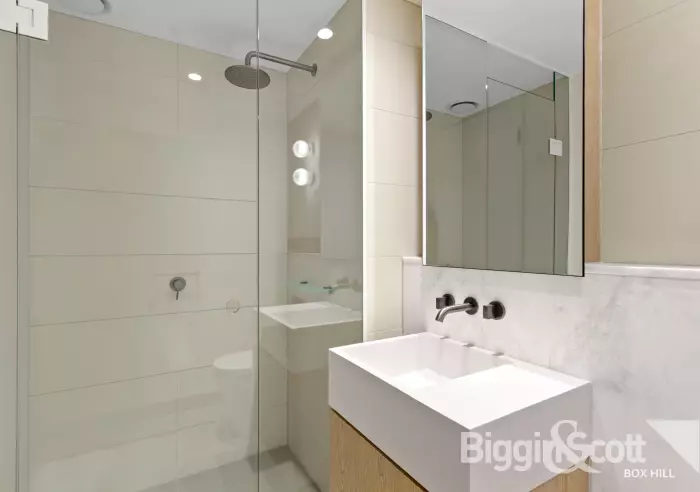 The apartment comprises two spacious bedrooms designed for comfort and style. The master bedroom is a true retreat, complete with a walk-in robe and a luxurious ensuite bathroom. The second bedroom is equally inviting, featuring a built-in robe and easy access to a second well-appointed bathroom located in the living area.
