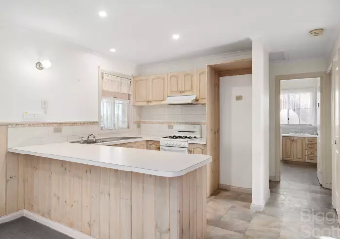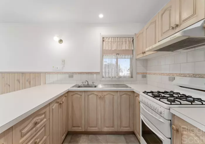 Step inside to discover a light-filled living area featuring charming bay windows and soft green views, complemented by gas heating and a split system for year-round comfort. The spacious kitchen is neat and functional, complete with gas cooking and ample bench and storage space.