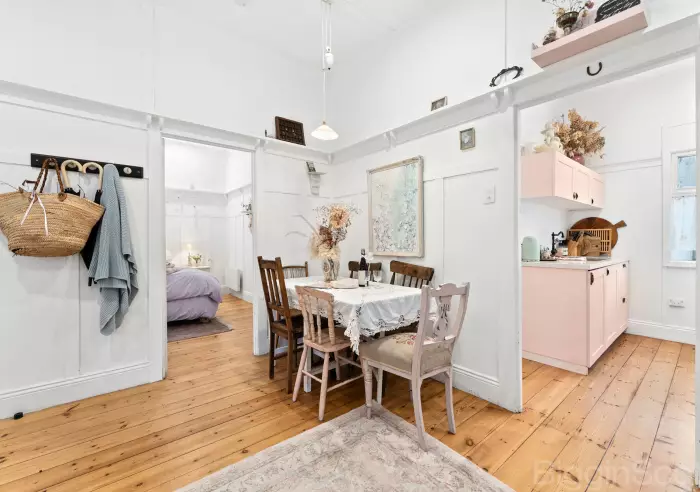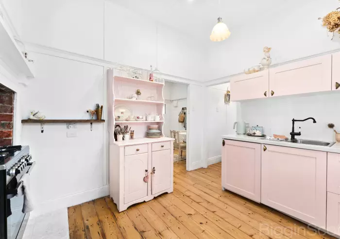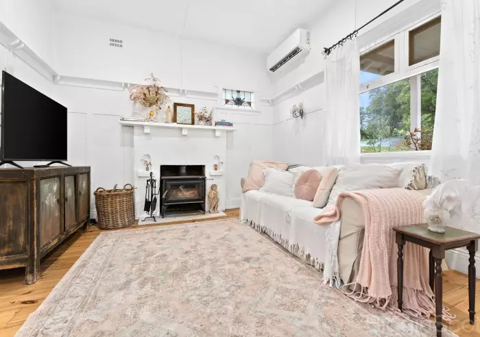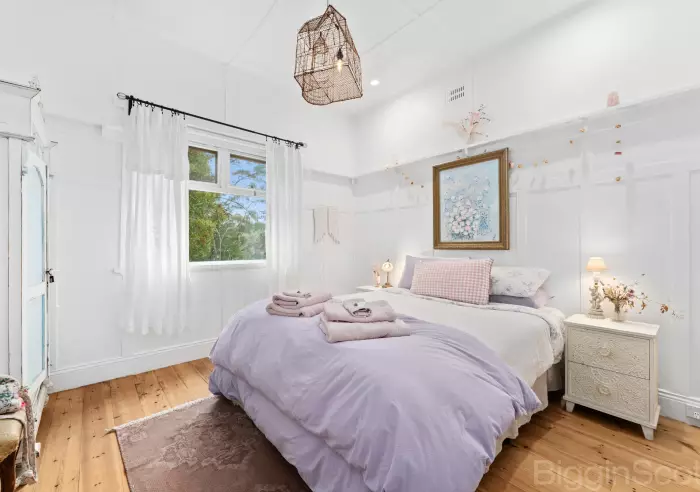 Spread over two levels, the main residence features two bedrooms, a beautifully renovated bathroom, and an inviting living space enhanced by timber floors, high ceilings, painted timber panelling, and a cosy wood fire. A bay window in the second bedroom frames leafy outlooks, while the vibrant kitchen, appointed with signature pink cabinetry and gas cooking, opens directly to a sunny north-facing deck, ideal for outdoor dining and entertaining. From here, steps lead down to a private firepit area nestled in the bushland surrounds.