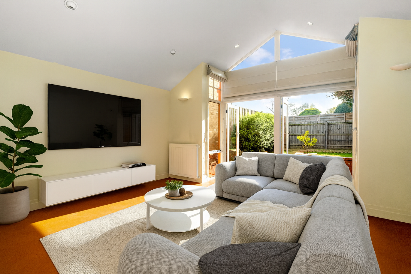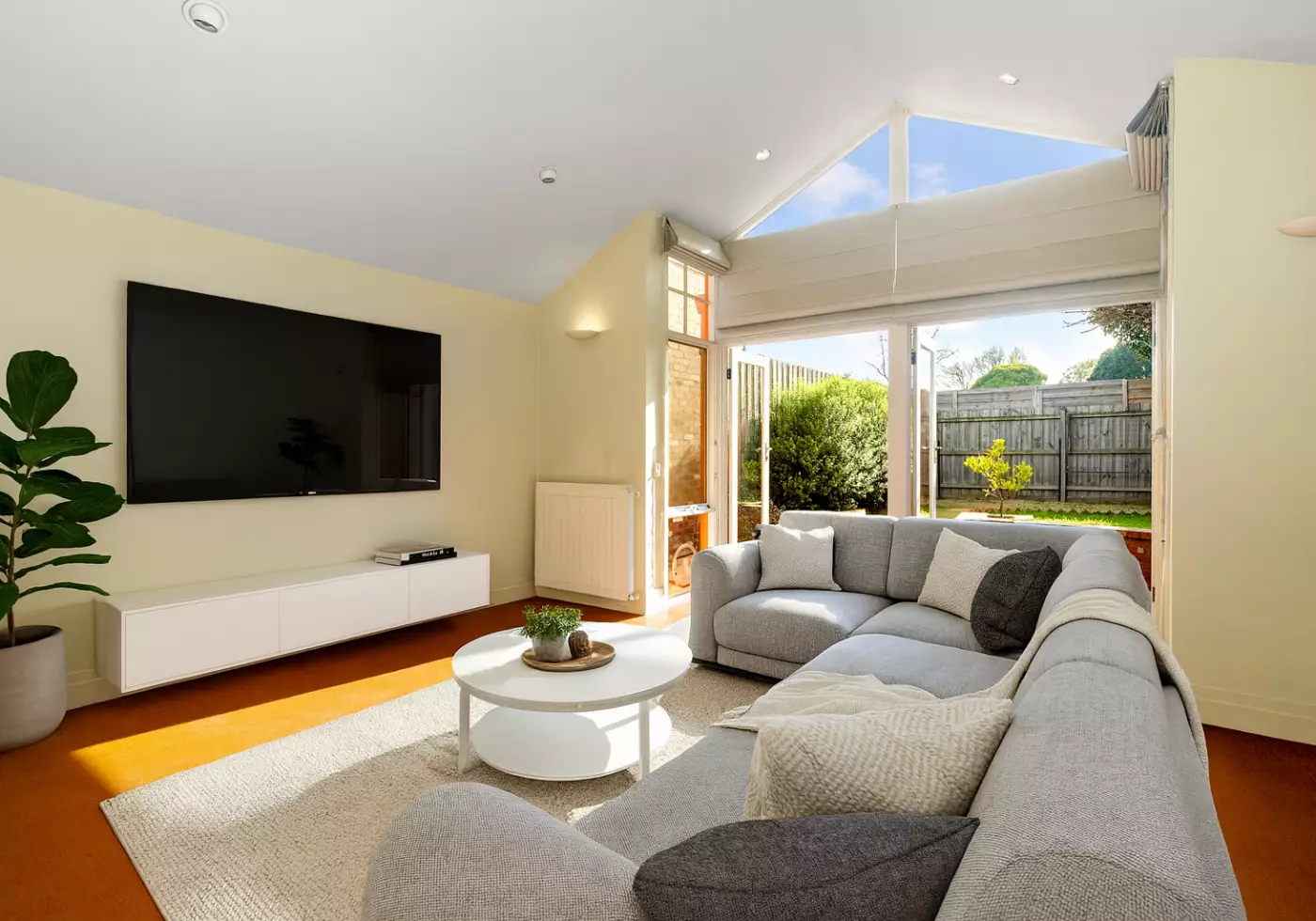 - Spacious open-plan lounge with split system for climate control, high-rise ceilings and double doors leading to;