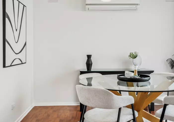 Accommodation includes three generously sized bedrooms, all with built-in storage. The master suite is a true sanctuary, featuring a spacious built in robe and a private ensuite bathroom. Both the ensuite and the central family bathroom are elegantly appointed and include state-of-the-art smart toilets, combining everyday convenience with a sophisticated, modern touch. Throughout the home, climate comfort is maintained with efficient split system heating and cooling, and a comprehensive security alarm system ensures peace of mind.